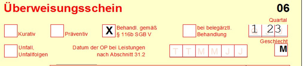 Für die medizinische Versorgung in der ASV (Ambulante Spezialfachärztliche Versorgung) ist eine Überweisung mit einem Kreuz bei „Behandl. gemäß §116b SGB V“ notwendig (vgl. §24 Abs.1 Satz 3 BMV-Ä).